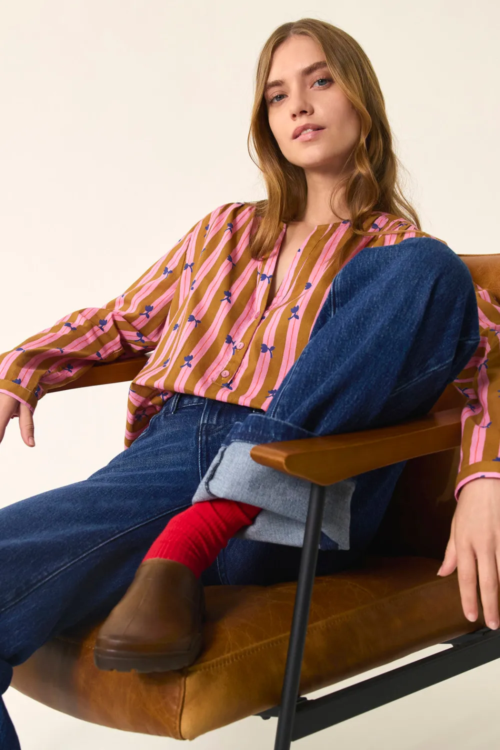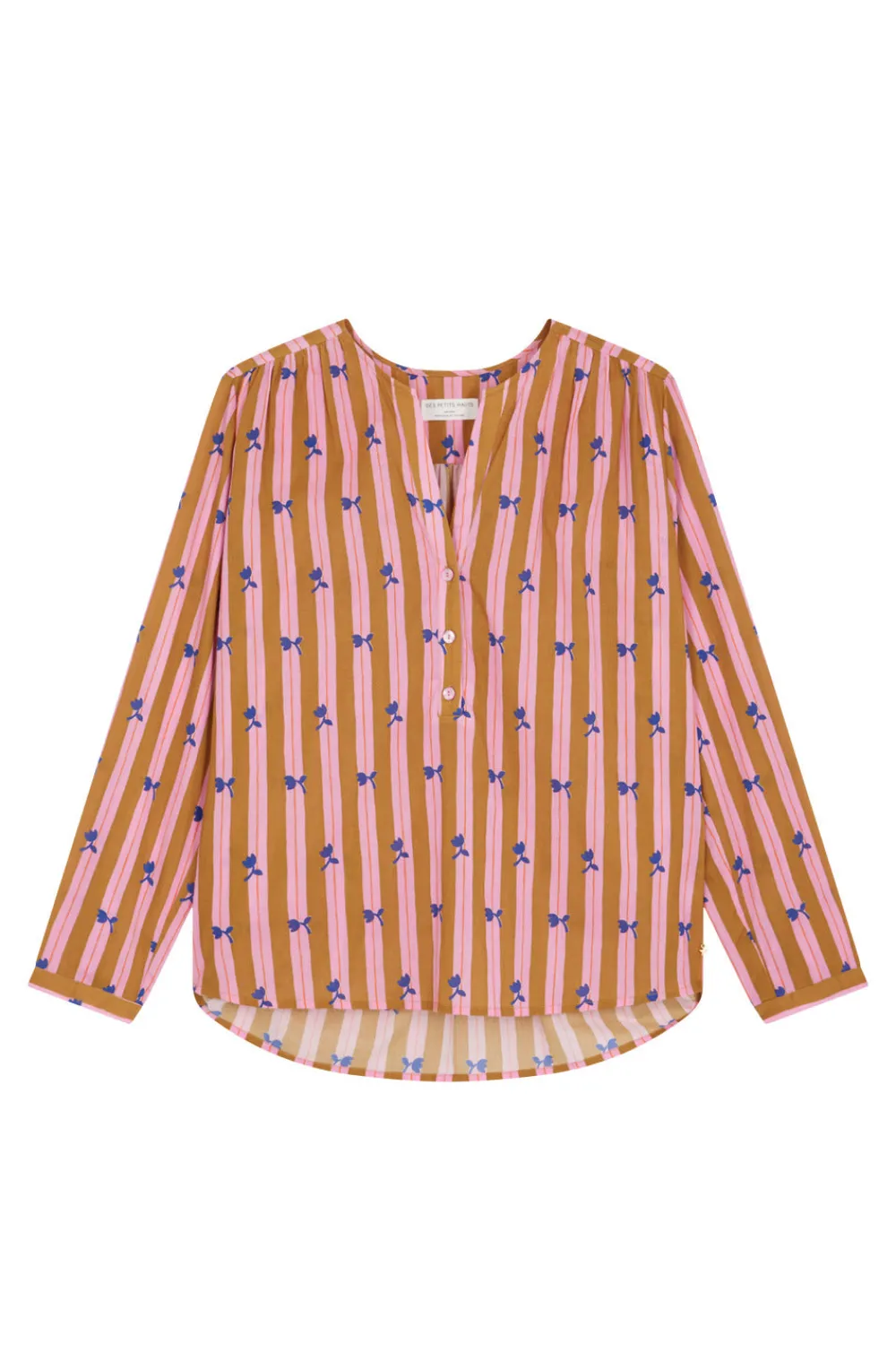 La blouse manches longues Effy transporte dans un univers bohème et coloré. Col tunisien et boutonnée, des fronces aux épaules et au dos subliment ce modèle à porter pour l’automne. • Blouse manches longues en voile de coton • Col tunisien boutonné • Fronces aux épaules et au dos • Poignets chemise • Imprimé exclusif Des Petits Hauts « Landes » composé de fleurs naïves façon papier découpé monochrome posées sur des rayures comme tracées à la main • Modèle dessiné à Paris par notre styliste • Longueur : 66,5 cm pour une taille 1 • Iolanta mesure 1m71 et porte une taille 1 • Conseil style : portez-la avec le pantalon large en velours Elaia et des bottines