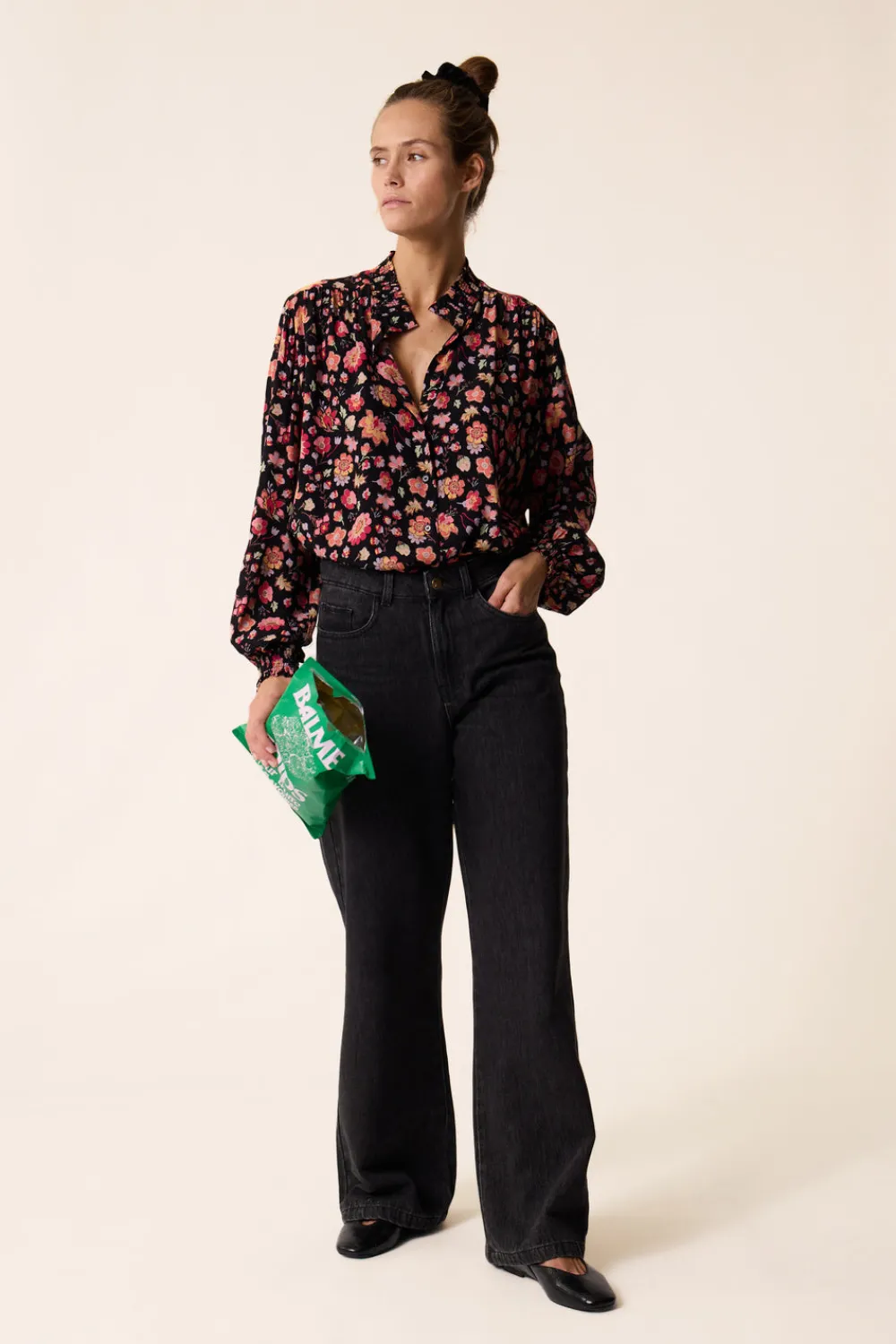 En viscose fluide et vaporeuse, la blouse manches longues Elizon dévoile tout son style pour l’automne. Smockée au col et en bas de manches pour un look rétro chic, cette pièce florale et colorée à porter rentrée dans un pantalon large taille haute apportera une dimension graphique à vos looks de saison. • Blouse manches longues en viscose • Col montant et poignets smockés • Épaules froncées • Ouverture boutonnée • Imprimé exclusif Des Petits Hauts « Windy » dessinant des fleurs aux détails délicats et aux couleurs vibrantes s’épanouissant sur un fond noir élégant • Modèle dessiné à Paris par notre styliste • Longueur : 64 cm pour une taille 1 • Alessandra mesure 1m74 et porte une taille 1 • Conseil style : portez-la avec le pantalon large Elaia et des bottines pour une silhouette citadine