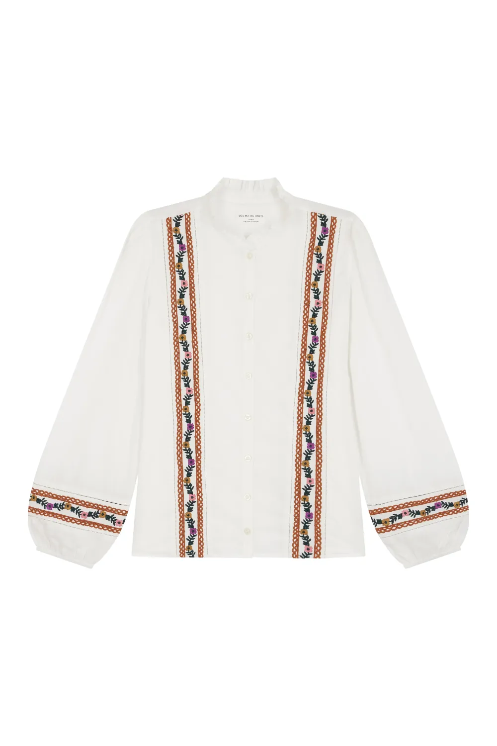 La blouse Reneto s’empare du style bohème folk avec ses fleurs colorées brodées et son coton doux et léger. Rehaussé d’une encolure volantée boutonnée, offrez-vous ce modèle rétro chic pour l’automne. • Blouse manches longues en coton • Fleurs colorées brodées • Encolure volantéeet • Bas de manches élastiqués • Ouverture boutonnée • Coloris Écru : un blanc écru hivernal • Modèle dessiné à Paris par notre styliste • Longueur : 64 cm pour une taille 1 • Sofia mesure 1m70 et porte une taille 1 • Conseil style : portez-la avec un jean évasé et les bottines Papilla pour un look bohème chic