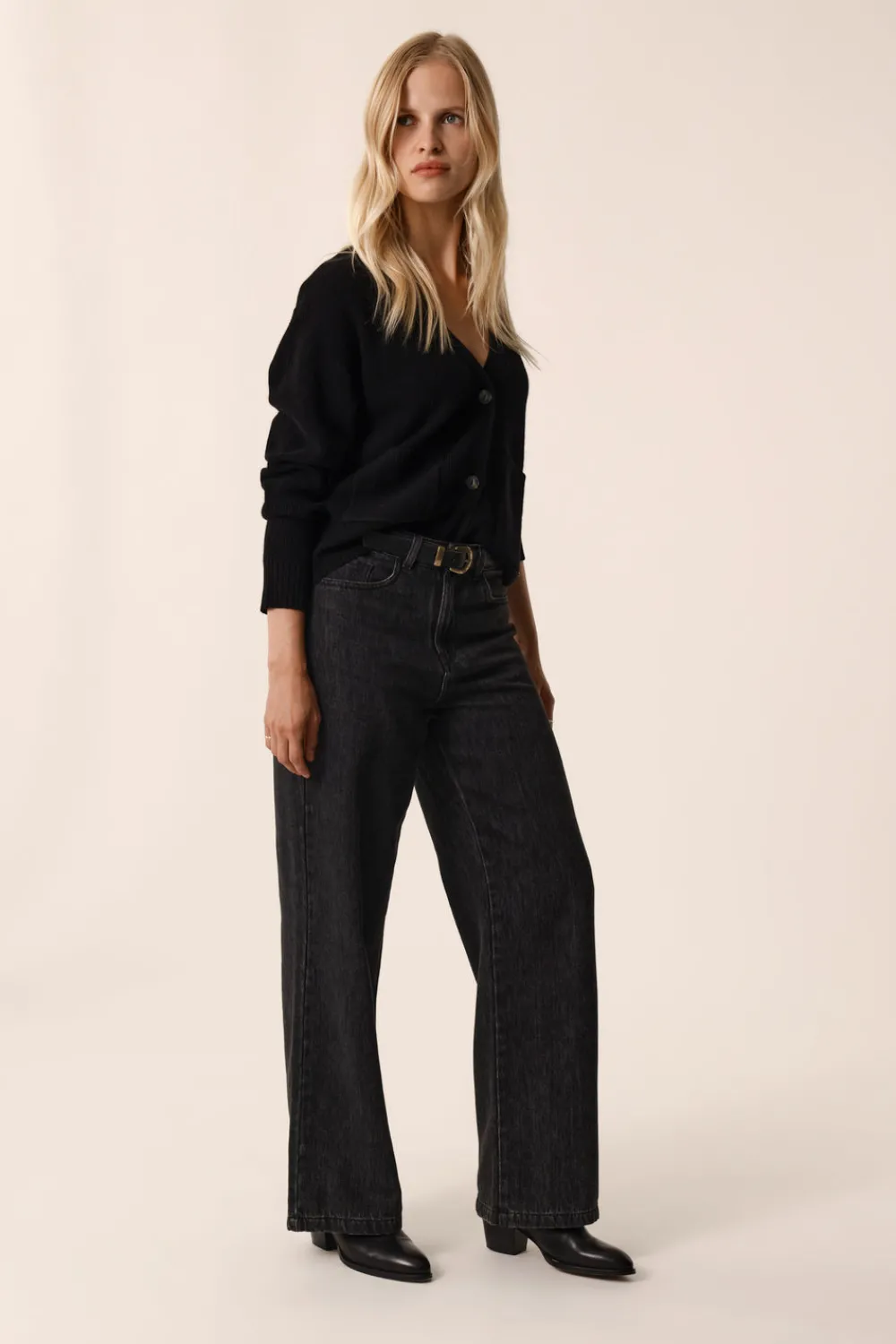 Le gilet côtelé en laine mérinos Artimus c’est le modèle cosy chic et versatile que vous allez aimer porter dès l’automne Avec son boutonnage doré et ses poches plaquées, il signe une allure résolument élégante. • Gilet oversize côtelé • Encolure V avec patte de boutonnage dorée • Poches plaquées • Finitions en bord-côte • Gilet réalisé en fil italien du groupe « Mérinos » en laine Mérinos. Maille épaisse toucher cachemire douce et chaude. • Coloris Noir : un noir intemporel • Modèle dessiné à Paris par notre styliste • Longueur : 59,5 cm pour une taille 1 • Jolien mesure 1m76 et porte une taille 1 • Conseil style : portez-le avec le pantalon large Evanou et les bottines Paloupa