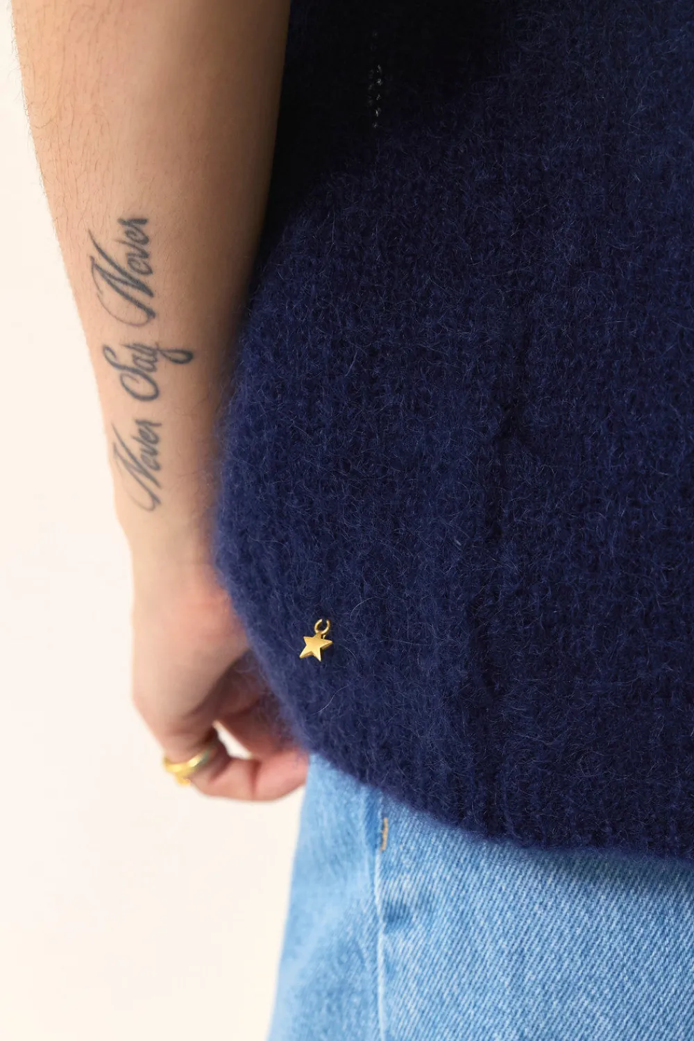 Modèle plebiscité l’hiver dernier pour son look vintage et sa versatilité, le gilet sans manches Bunny est décliné dans de nouveaux coloris. Porté sur une robe ou un t-shirt avec un jean large, il vous accompagnera tout au long de la saison.• Gilet sans manches• Coupe droite bord à bord• Encolure V• Finitions en bord-côte• Gilet en maille réalisé en fil italien du groupe « Moelleux » 62% Kid Mohair et 20% laine mérinos certifiée sans Mulesing. Fil exclusif et emblématique de la marque depuis 10 ans, il est gonflant, chaud, doux et duveteux.• Coloris Marine : un bleu nuit intense• Modèle dessiné à Paris par notre styliste• Longueur : 60 cm pour une taille 1• Sofia mesure 1m70 et porte une taille 1• Conseil style : portez-le sur la robe longue Solange ou avec un t-shirt blanc et le jean Louela