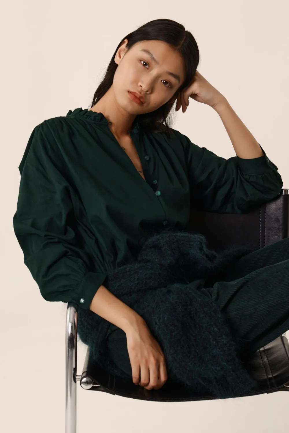 Rudy offre une silhouette bohème chic avec ses lignes travaillées de fronces et son col volanté. En popeline de coton douce et légère, cette blouse boutonnée esprit chemisier déclinée dans des coloris inédits demeure une valeur sûre. • Blouse en coton uni • Manches longues à poignets boutonnés • Col volanté avec patte de boutonnage • Détails froncés aux épaules • Coloris Épicéa : un vert foncé • Modèle dessiné à Paris par notre styliste • Longueur : 64 cm pour une taille 1 • Emilie mesure 1m77 et porte une taille 1 • Conseil style : portez-la avec le jean Lulu pour une silhouette chic décontractée
