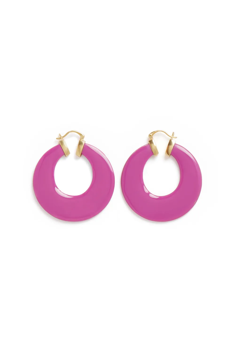 Légèrement bombée et glossy à souhait, les créoles Madi adoptent un look rétro avec leur anneau en acétate. Classique ayant gagné les coeurs et les boîtes à bijoux, elles sublimeront un look de jour ou du soir. • Créoles épaisses en acétate • Finition brillante • Fermoir attache poussoir • Adaptées aux oreilles percées • Coloris Lupin : un rose fuchsia • Ø 4,5 cm • Livrées avec un pochon de rangement • Exclusivité DPH x Feeka
