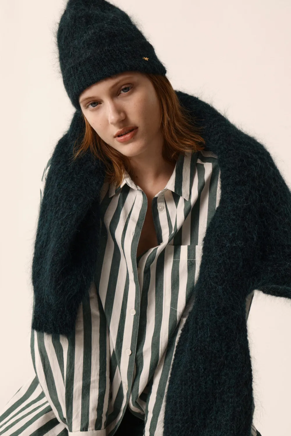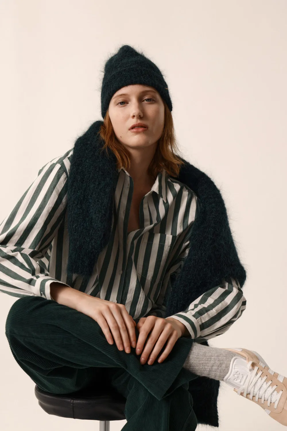 La chemise à rayures verticales sort de la case officewear pour devenir une it-pièce à porter sans modération. Inspirée du vestiaire masculin avec sa coupe oversize et ses rayures colorées pour un look moins solennel, Sesame pourrait bien détrôner l’iconique marinière. • Chemise oversize longue • Col et poignets chemise • Poche plaquée sur poitrine • Ouverture boutonnée • Coloris Épicéa et Crème : un vert foncé et un blanc crème • Modèle dessiné à Paris par notre styliste • Longueur : 81 cm pour une taille 1 • Josie mesure 1m77 et porte une taille 1 • Conseil style : portez-la ouverte sur un t-shirt à message ou avec la jupe longue en jean Louria
