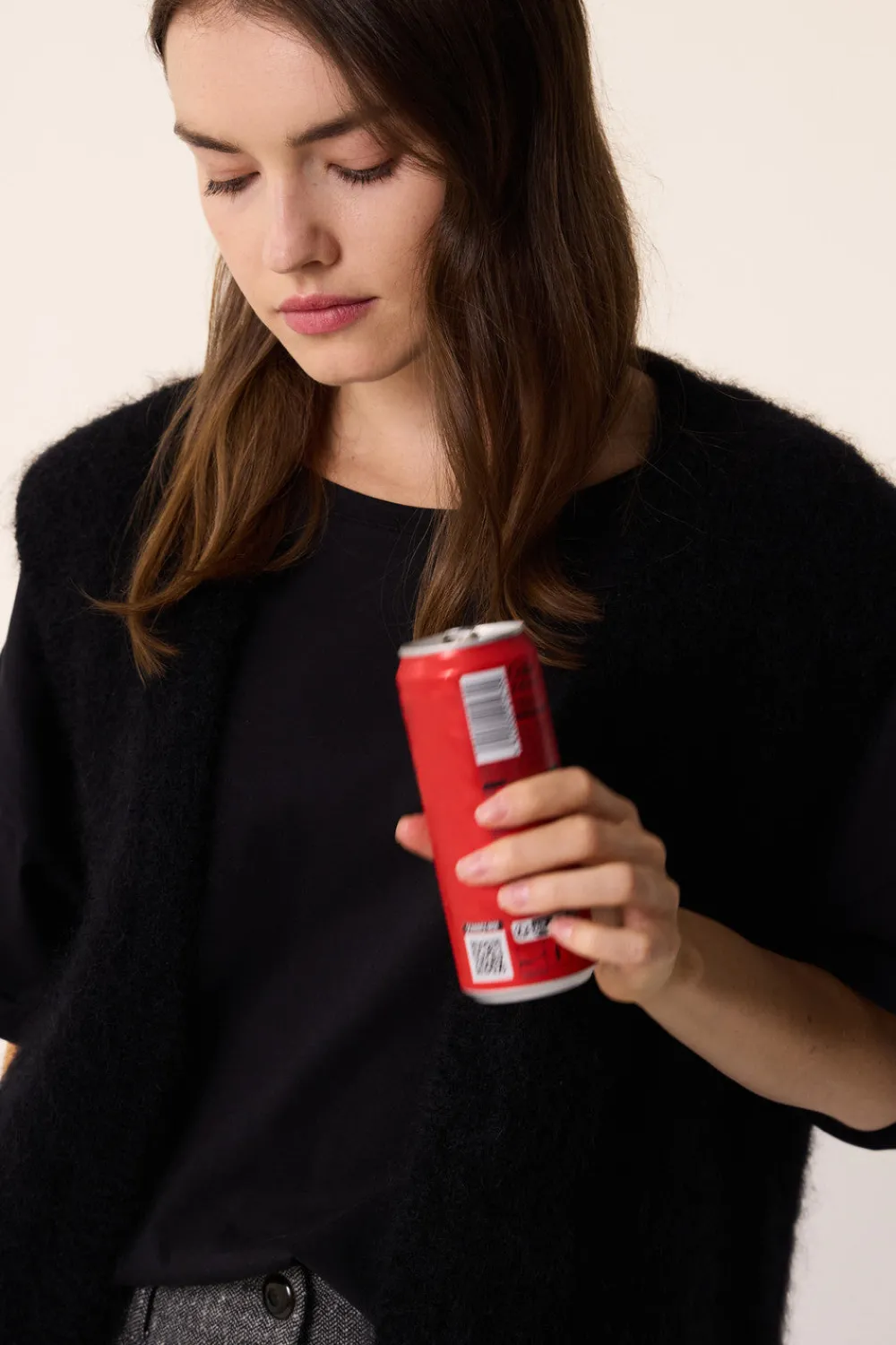Modèle plebiscité l’hiver dernier pour son look vintage et sa versatilité, le gilet sans manches Bunny est décliné dans de nouveaux coloris. Porté sur une robe ou un t-shirt avec un jean large, il vous accompagnera tout au long de la saison.• Gilet sans manches• Coupe droite bord à bord• Encolure V• Finitions en bord-côte• Gilet en maille réalisé en fil italien du groupe « Moelleux » 62% Kid Mohair et 20% laine mérinos certifiée sans Mulesing. Fil exclusif et emblématique de la marque depuis 10 ans, il est gonflant, chaud, doux et duveteux.• Coloris Noir : un noir intemporel• Modèle dessiné à Paris par notre styliste• Longueur : 60 cm pour une taille 1• Kryzia mesure 1m70 et porte une taille 1• Conseil style : portez-le sur la robe longue Solange ou avec un t-shirt blanc et le jean Louela
