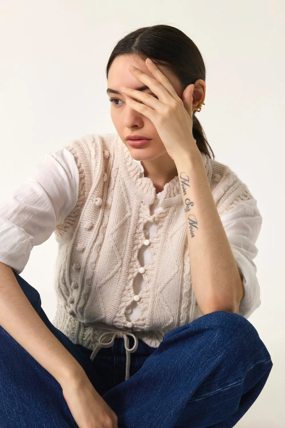Cette saison encore, le gilet sans manches confirme son statut d’incontournable. Rétro bohème avec sa maille fantaisie en laine et son boutonnage, porté ouvert sur une blouse florale ou fermé sur une chemise longue, tous les looks s’offrent à vous avec le gilet court Dolly. • Gilet sans manches coupe court • Tricotage fantaisie • Encolure ronde| Ouverture boutonnée • Lien de serrage en base • Gilet court réalisé dans un nouveau fil italien du groupe « Cute » composé de laine d’Australie apportant de la douceur et de nylon pour la résistance l’élasticité • Coloris Crème : un blanc crème • Modèle dessiné à Paris par notre styliste • Longueur : 45 cm pour une taille 1 • Sofia mesure 1m70 et porte une taille 1 • Conseil style : portez-le sur un t-shirt manches courtes avce un jean large et des bottines pour un look rétro