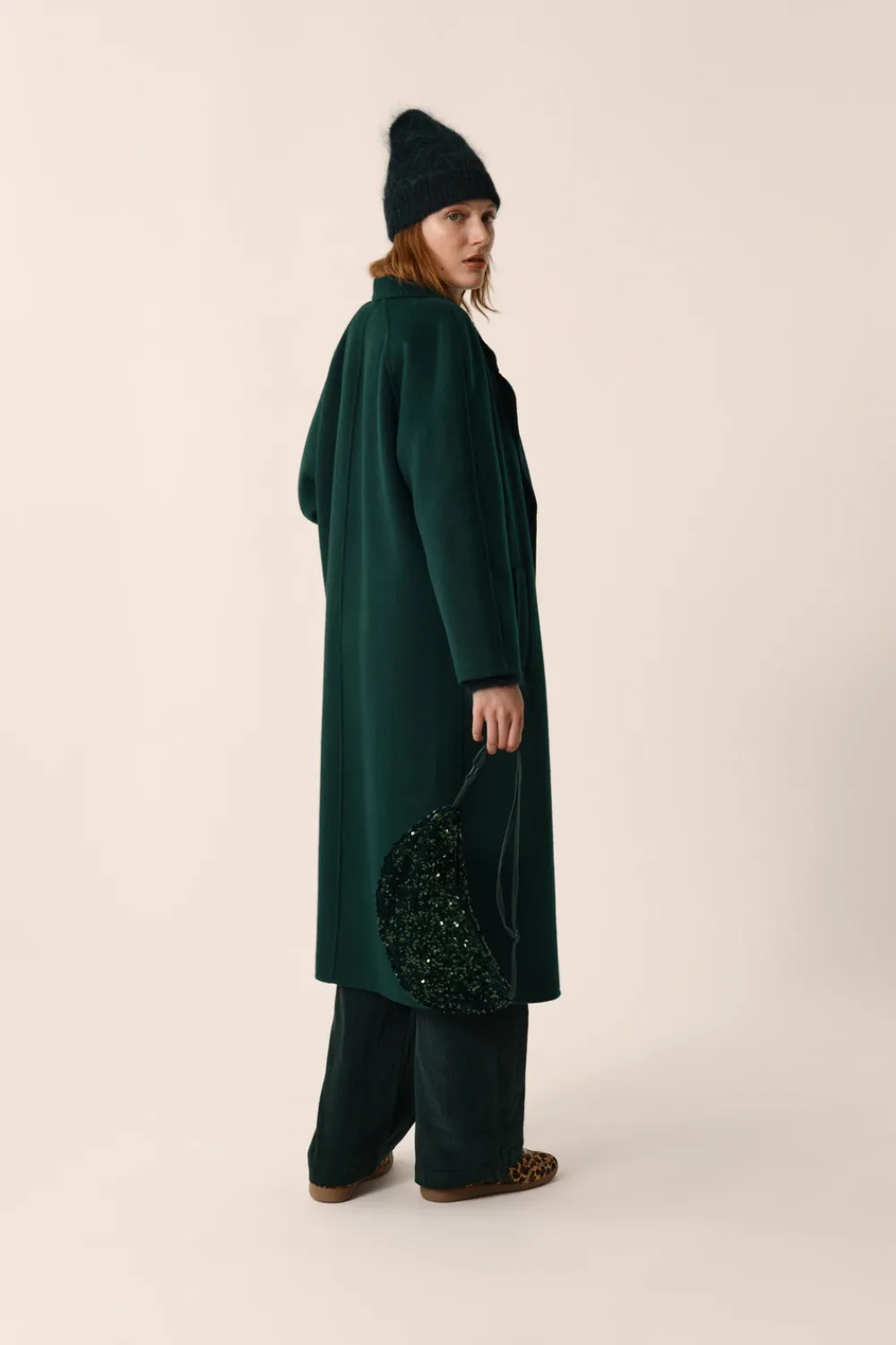 Lignes minimalistes et look intemporel, le manteau long Yvani se distingue avec sa coupe loose oversize et son boutonnage simple. Ultra chic, ce manteau au volume augmenté se portera facilement sur une robe ou en accumulation sur un sweat et un gilet en bouclette. • Manteau long en laine • Volume loose et large • Manches longues raglan • Col tailleur • Poches paysannes • Fermeture boutonnée • Modèle sans doublure • Coloris Épicéa : un vert foncé • Modèle dessiné à Paris par notre styliste • Longueur : 121 cm pour une taille 1 •Josie mesure 1m77 et porte une taille 1 • Conseil style : portez-le en total look oversize avec la robe Tomeo et les bottes Papricia