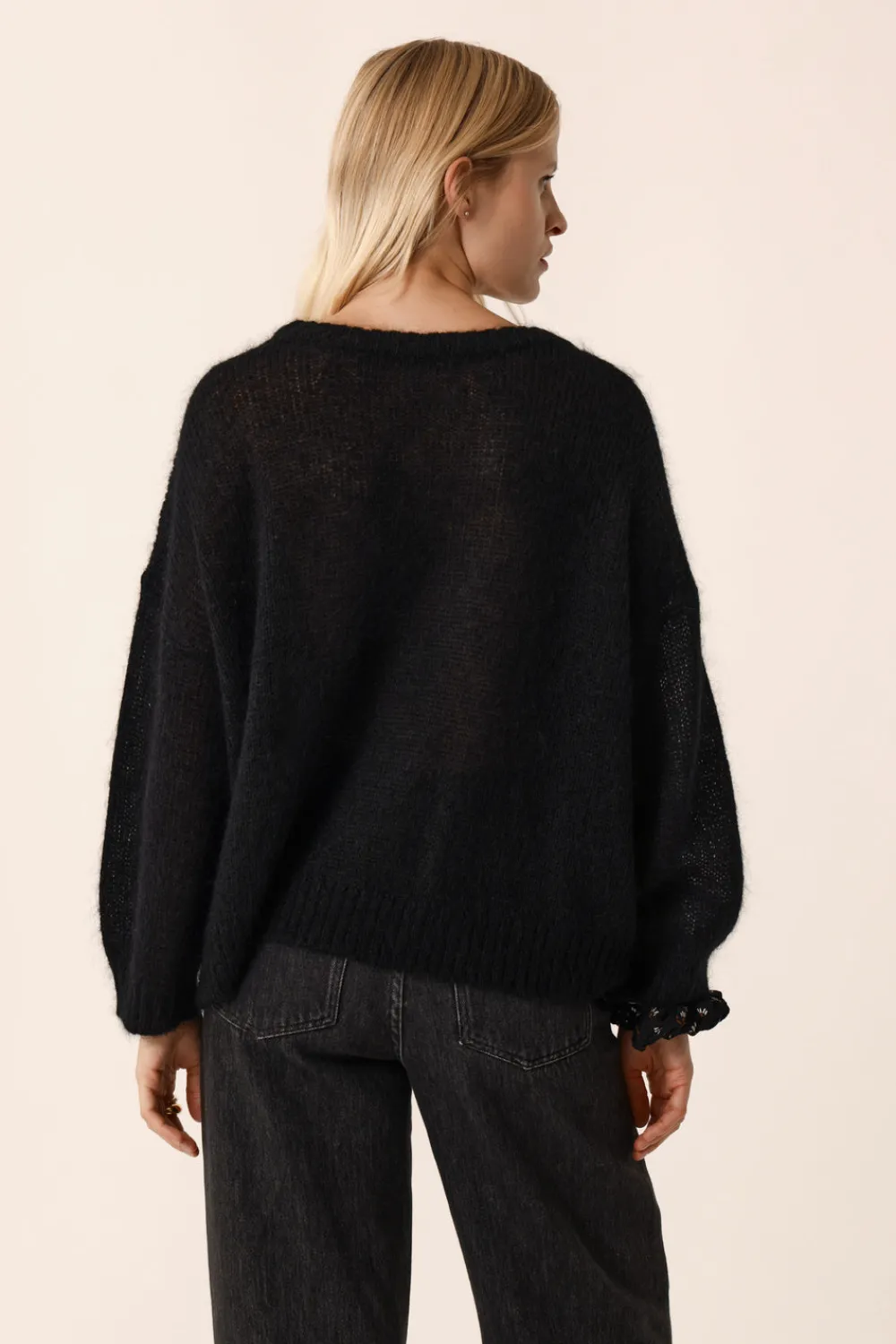 Le pull oversize Bulon fait partie de ces indispensables qu’on aime trouver dans son vestiaire au moment de composer une tenue chic décontractée. Portez-le avec le duo jean/ bottines ou rentré dans une jupe à motifs. • Pull large encolure ronde • Emmanchures décalées • Finitions en bord-côte • Pull femme réalisé en fil du nouveau groupe « Mohair » composé de Kid Mohair d’Afrique du Sud et laine d’Australie. Fil certifié RMS & RWS et garanti sans Mulesing. • Coloris Noir : un noir intemporel • Modèle dessiné à Paris par notre styliste • Longueur : 58 cm pour une taille 1 • Jolien mesure 1m76 et porte une taille 1 • Conseil style : choisissez la jupe en velours Siara et les bottes Papricia pour une silhouette rétro chic