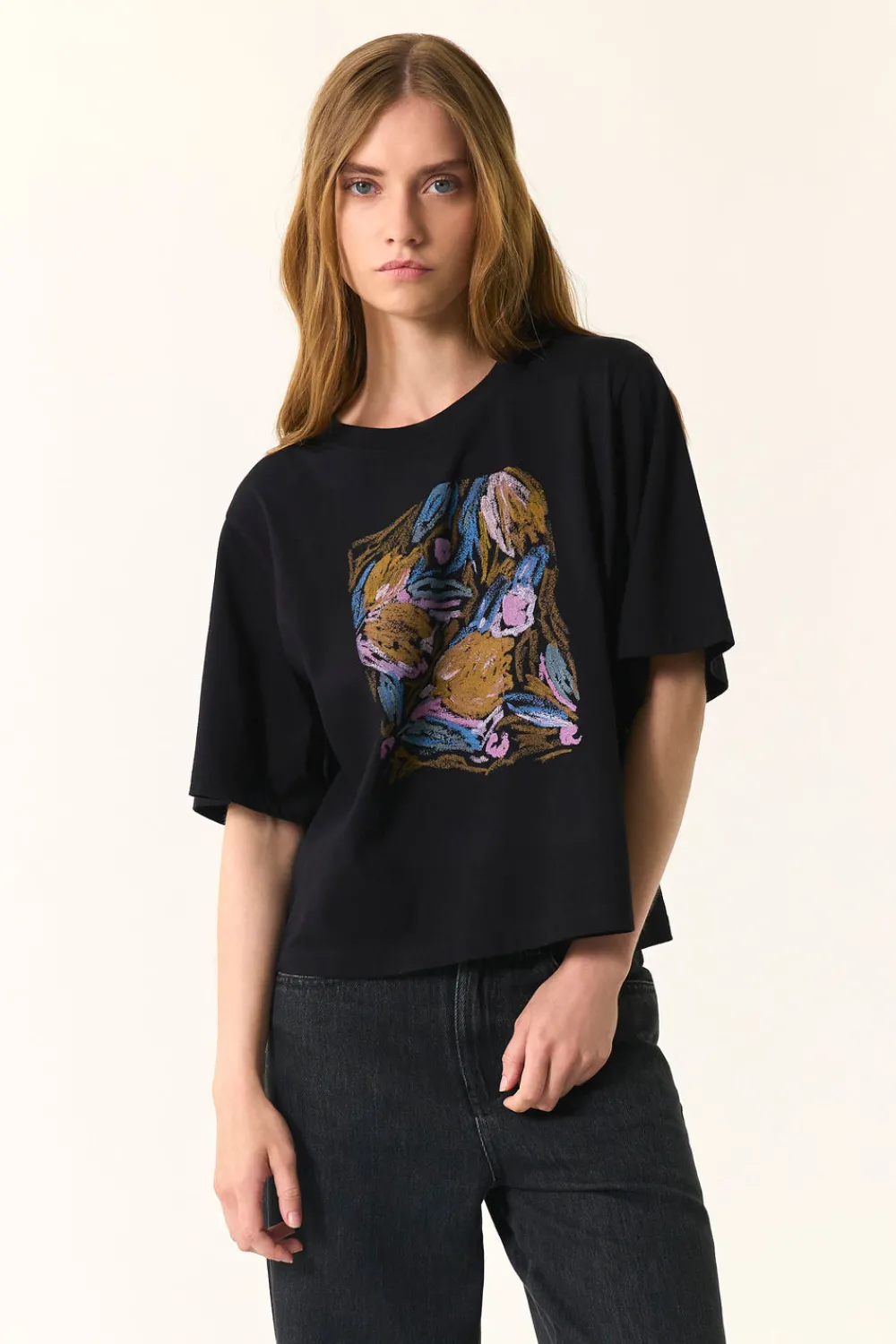 Basique du vestiaire qu’on aime porter avec un jean ou pour un look plus habillé, le t-shirt manches courtes Janis se démarque avec son imprimé arty. • T-shirt manches courtes imprimé • Col rond • Imprimé exclusif « Gardenia » dessinant un motif abstrait de végétaux réalisés à la peinture • Coton jersey doux et fluide Oeko-Tex • Coloris Noir : un noir intemporel • Modèle dessiné à Paris par notre styliste • Fabriqué au Portugal • Longueur : 55 cm pour une taille 1 • Iolanta mesure 1m71 et porte une taille 1 • Conseil style : portez-le avec le pantalon tailleur large Siloe et le blazer Silvestre coordonné pour un look casual chic